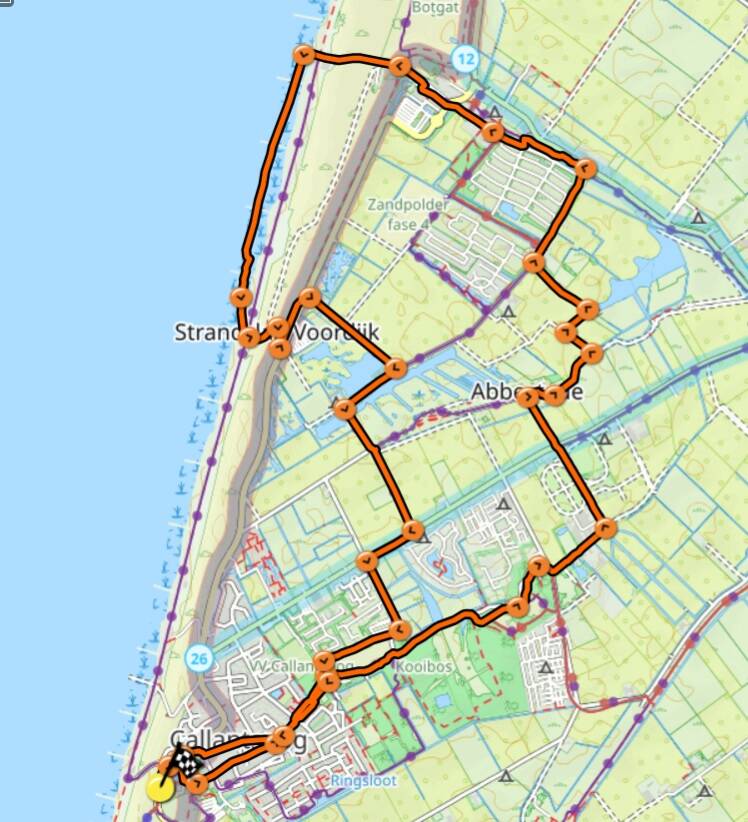 Bij de Vinkentoren RD. Aan het eind de verkeersweg oversteken en RA over het fietspad. Na plaatsnaambord Callantsoog LA, Kruisweg. Na boerderij De Wolken eerste pad RA natuurgebied Binnenduinrand Zijpe in. Aan het eind LA, tegelpad. Einde tegelpad RA. Bij de huizen RA over het linker voetpad. Steeds RD langs Dorpshuis Kolfweid en Albert Heijn. Je komt uit op het Dorpsplein.