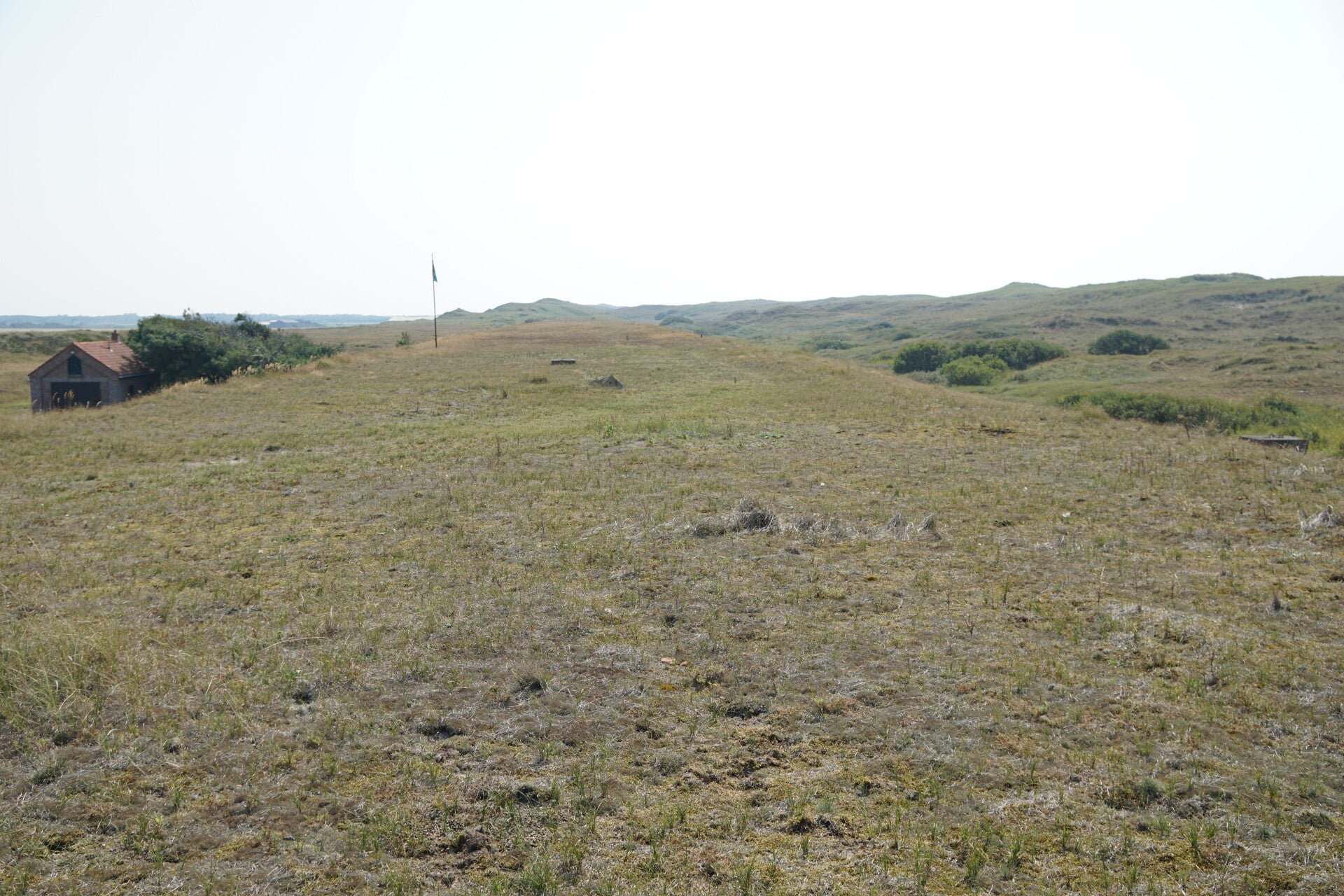 Ga LA over de opgang naar het strand. Steek het fietspad over en ga RD langs de wit/rode slagboom. Als je goed kijkt zie je ter hoogte van een metalen hek links en rechts in het duinlandschap nog de contouren van de oude Zanddijk.