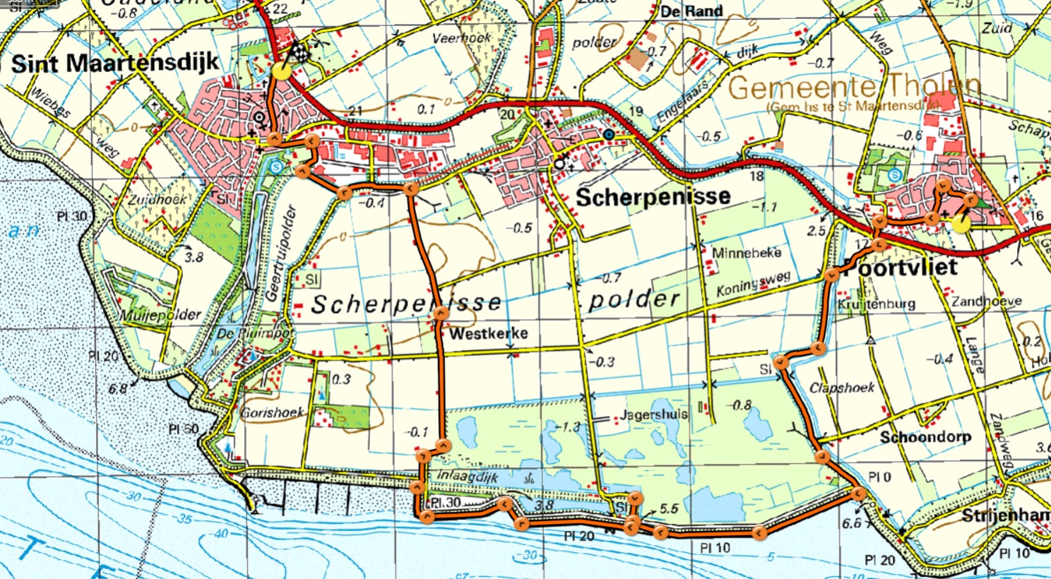 Steeds RD. Aan het eind LA, Gorishoeksedijk. Negeer de weg die Sint Maartensdijk ingaat. In de bocht naar links, waar de struiken ophouden, schuin RA naar beneden en direct daarna RA. Je loopt langs een akker. Voor ijzeren hekken schuin rechts omhoog. Het pad loopt om sportvelden heen. Langs een leuning naar beneden. Wordt klinkerweg. Aan het eind de verkeersweg oversteken en LA. Molendijk oversteken. Daarna eerste straat RA langs een praathuisje en RD, Kaaistraat. Ga steeds RD tot je uitkomt bij de Provincialeweg. Rechts zijn de bushaltes.