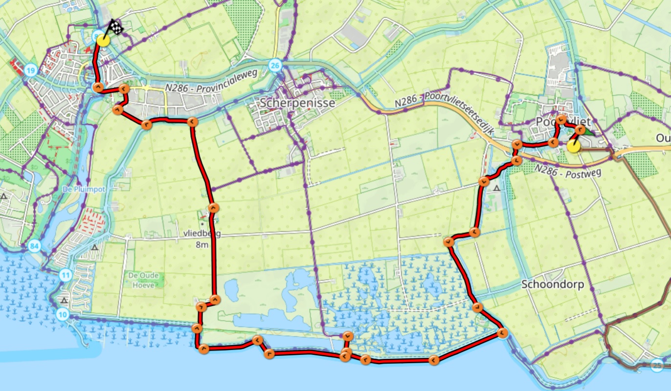 Als je Poortvliet binnen loopt valt je al snel de imposante St. Pancratiuskerk op. Aan deze kerk is te zien dat Poortvliet vroeger een belangrijke plaats was. Na een rondje om de kerk verlaten we het dorp en lopen de natuur in. Een trekpontje brengt ons naar de overkant van een watergang. Over een dijkje met ratelende populieren slingeren we naar de Oosterschelde. Rechts zien we de monumentale Schelphoekhoeve met historische tuin. Links het voormalige stoomgemaal Oosterschelde, waarvan de schoorsteen in het water staat. We lopen verder langs de oever van de Oosterschelde en klimmen even de dijk over om uit te kijken over de vogelrijke Scherpenissepolder. Na dit prachtige natuurgebied gaan we landinwaarts en komt de vliedberg van Westkerke in zicht. Van het oorspronkelijke dorp met een kerk, kasteel en rechthuis is nog slechts een buurtschap over. Hierna koersen we op Sint Maartensdijk aan. Langs het Praathuisje bij de voormalige haven lopen we het oude stadje binnen. De middeleeuwse Maartenskerk en de monumentale panden aan de Markt herinneren aan een rijk verleden. Daarmee maken we op de volgende etappe kennis.