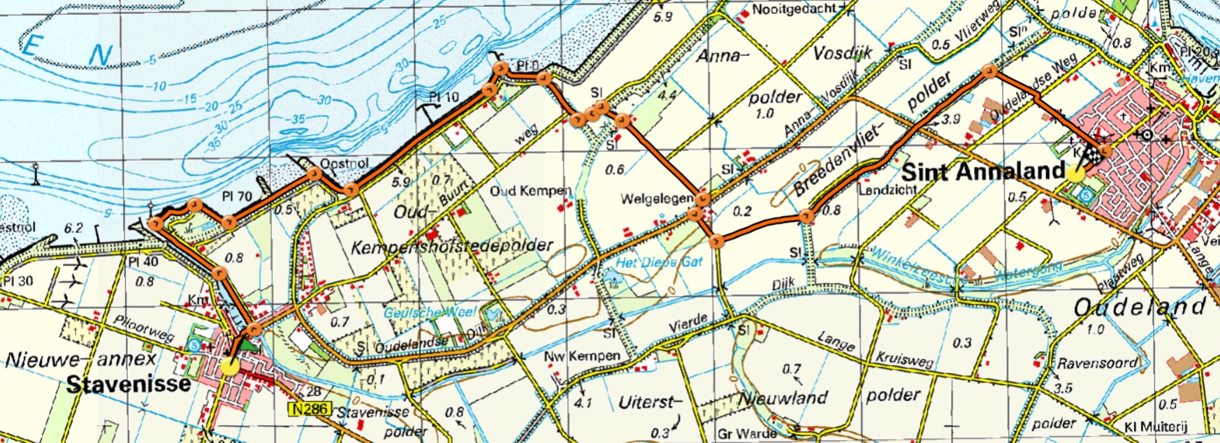 De westkust van Tholen heeft het zwaar te verduren gehad in de strijd tegen het water. Vanaf de 14e eeuw teisterden stormvloeden de kust, waarvan de Watersnoodramp in 1953 nog steeds in het collectieve geheugen staat gegrift. Maar ook de mens zelf veroorzaakte overstromingen, bijvoorbeeld door moernering. De inwoners van Moggershil groeven veen af voor turf- en zoutwinning en ondermijnden zo hun eigen land. In 1944 zetten de Duitsers het grootste deel van Tholen onder water. Op deze etappe is nog op veel plaatsen de eeuwigdurende strijd tegen het water te zien. Eerst staan we stil bij de Hervormde Kerk in Stavenisse. Op de toren staat een gedenksteen en een markering van de waterstand van 1953. Door de Voorstraat lopen we naar de haven die tot in het dorp reikt. Het had niet veel gescheeld of de haven was in het kader van de Deltawerken afgedamd. Dankzij het hevig verzet van de bevolking mocht de haven open blijven. Een keersluis in de mond van het havenkanaal beschermt nu het dorp Stavenisse bij hoogwater. Vanaf hier volgen we voor een groot deel het Oosterscheldepad langs het water. Ter hoogte van het verdronken dorp Moggershil verlaten we de dijk en lopen de Rijkebuurtweg in. Vóór 1953 was hier een gehucht met een drietal boerderijen en wat huizen dat Rijkebuurt werd genoemd. Alles verdween door de Watersnoodramp. In de polder worden we getrakteerd op kleurrijke bloemenvelden. Veel boeren zijn overgegaan op de tulpenteelt en het kweken van bloemzaad. Na de laatste kassen bereiken we over een tussendoorweggetje Sint Annaland.
