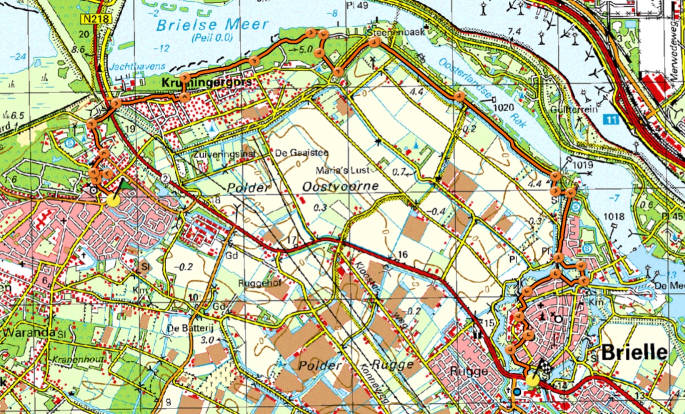 Je komt uit op het fietspad. Ga RA en direct daarna weer RA, asfaltweg. In de bocht, voor het plaatsnaambord van Brielle, RA. Ga bij het blauwe bord Brielle RD over het voetpad langs de singel. Aan het eind RA.