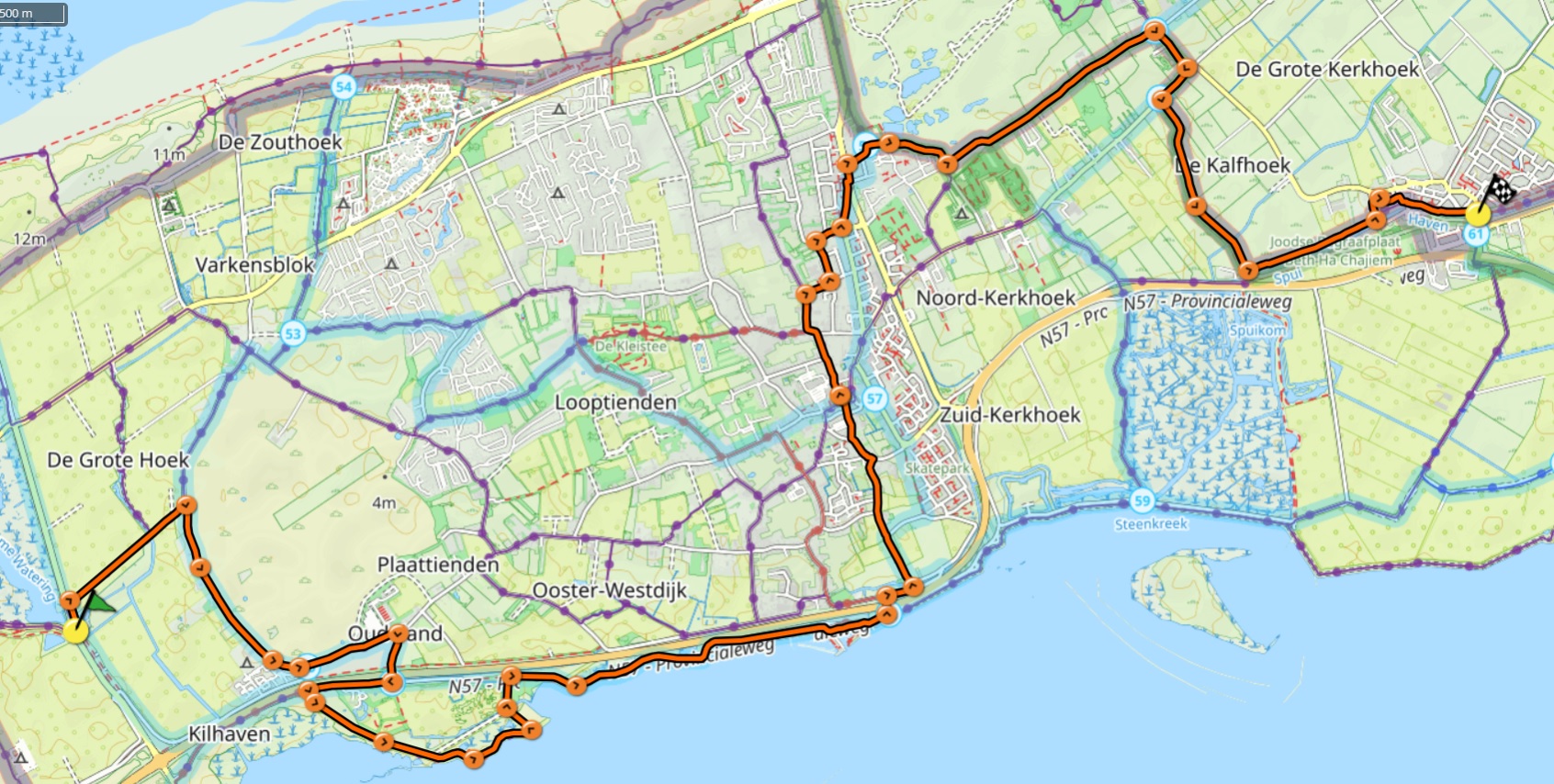 De weg maakt een bocht naar links. Bij ANWB fietswijzer RD. Je loopt het Oudeland in, een van de vier dorpjes die nu Ouddorp vormen. Sta even stil bij boerderij De Druuve op nummer 75. Vroeger was het een “Duinspulletje” dat ook dienst deed als landcafé. Hierna eerste weg RA richting Grevelingenmeer. Na het viaduct RA. Bij een metalen hek LA de Preekhilpolder in, Oudelandse Zeedijk. Volg de dijk met links de inlaag en rechts het Grevelingenmeer.