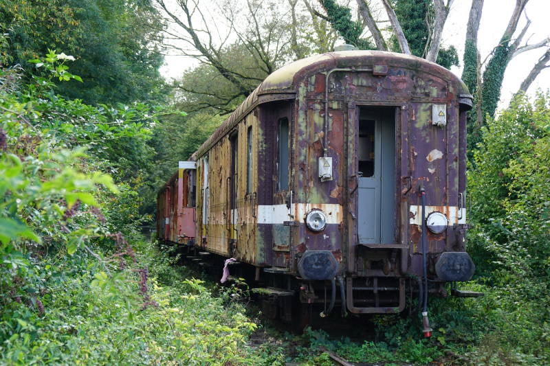 In de verte weer een spoorwegviaduct. Deze spoorlijn wordt nog gebruikt. Opgeheven spoorlijnen worden hergebruikt als fiets- of wandelpad of zijn overwoekerd en vervallen. Zo kun je zomaar een oud treinstel tegenkomen dat staat weg te roesten.