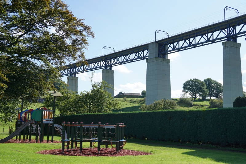 We volgen de Geul langs een rotswand en een eeuwigdurende kalkoven. Even later hebben we zicht op het hoogste, grootste en langste spoorwegviaduct van België: het viaduct van Moresnet. De brug over het dal van de Geul werd in 1915-1916 gebouwd voor het transport van Duitse artillerie en troepen naar het front tijdens de Eerste Wereldoorlog. We passeren de grens van het vergeten ministaatje Neutraal Moresnet, dat vroeger bij het Vierlandenpunt grensde aan Nederland.