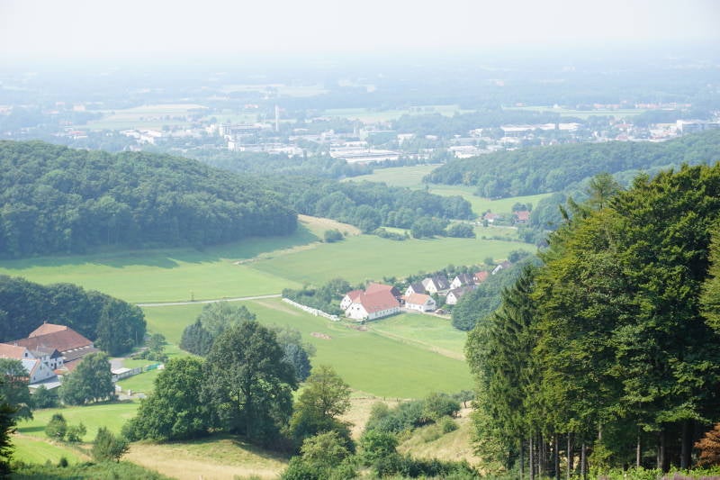 Het is een hele toer om vanaf het station bij Dissen weer op de kamweg te komen. Als we eindelijk bij de uitkijktoren op de Steinegge zijn, hebben we er al een hele wandeling op zitten. Maar eenmaal boven loopt het makkelijk op de smalle kamweg. Even voorbij Borgholzhausen, dat bekend staat om zijn honingkoeken in allerlei soorten en maten, dient de middeleeuwse Burg Ravensberg zich aan. Naast de toren is een Gaststätte. Vanaf het terras heb je een prachtig uitzicht.