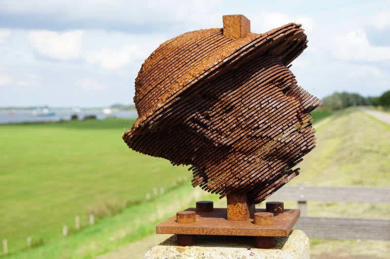 Even verderop staat een monument ter nagedachtenis aan vier soldaten die op 26 oktober 1944 werden gedood nadat hun patrouille in een hinderlaag liep. Het bronzen hoofd is niet van koningin Wilhelmina, zoals wij dachten, maar van een Engelse soldaat. De scheur in het gezicht is niet vanwege ouderdom, maar is daar bewust in aangebracht.