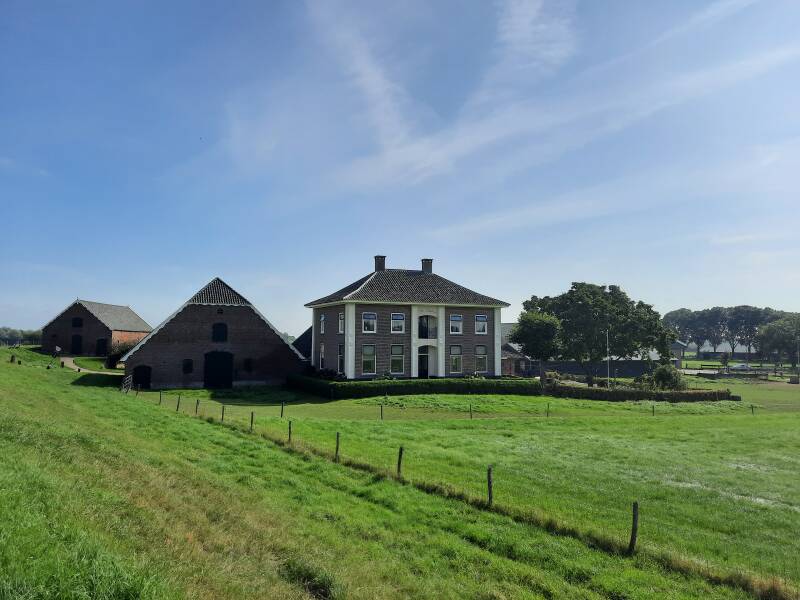 We hebben geen zin in het steile glibberpaadje dat je direct na de brug op wat voor 'n manier dan ook naar beneden brengt. Dus slaan we direct linksaf de rustige Marsdijk op. Nu kijken we vanaf de andere kant op de Grebbeberg. Mooi is te zien hoe abrupt de stuwwal hier eindigt. Na de statige boerderij De Ambtse maakt het asfalt plaats voor een tegelpad. We delen het pad met fietsers en komen uit bij natuurgebied Maneswaard en het Hoornwerk De Spees.
