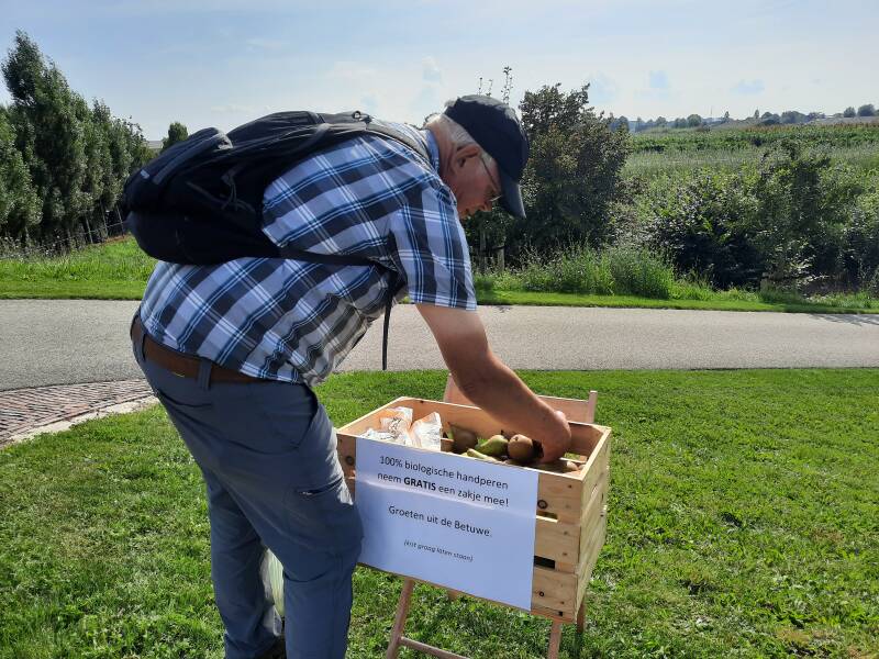 We lopen verder over de Rijnbandijk en maken natuurlijk gebruik van het aanbod een zak biologische peren mee te nemen. Ze zijn nog gratis ook en dat doet ons Hollandse hart sneller kloppen. Onze gretigheid gaat niet zover dat we ook het kistje meenemen.