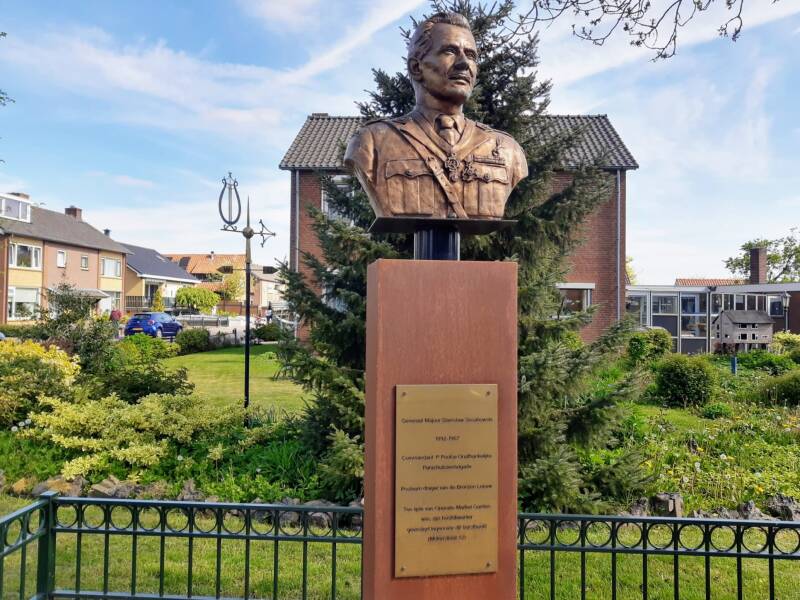 Na al deze informatie gaan we op stap. We komen langs het borstbeeld van Sosabowski dat op 18 september 2020 tijdens de 75-jarige herdenking van Market Garden tegenover zijn hoofdkwartier aan de Molenstraat 12 werd onthuld. Het is een replica: de originele buste staat in Warschau.