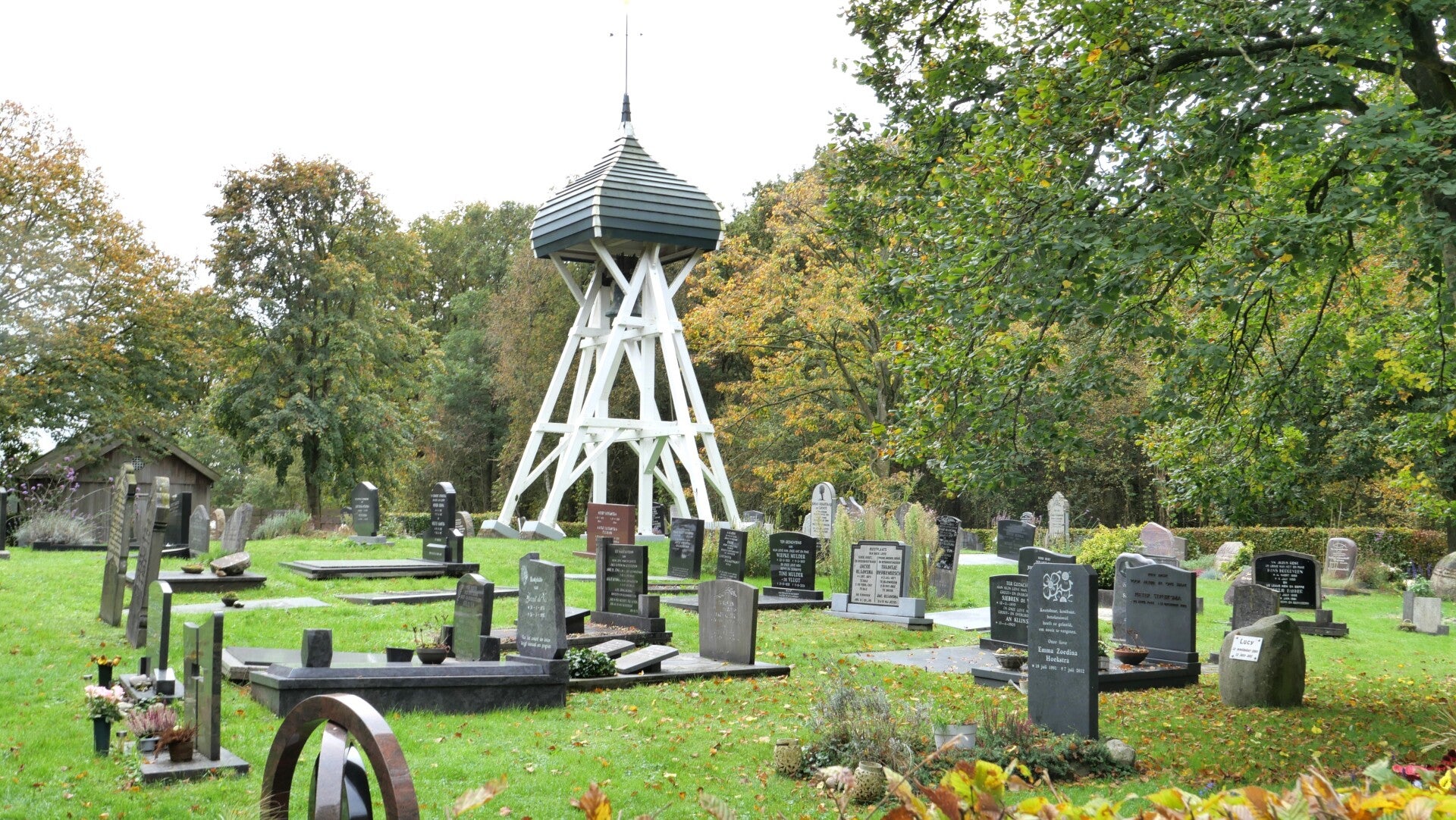 Het pad komt uit op een asfaltweggetje. Ga RA. Vóór de klokkenstoel RA langs de haag van de begraafplaats.
