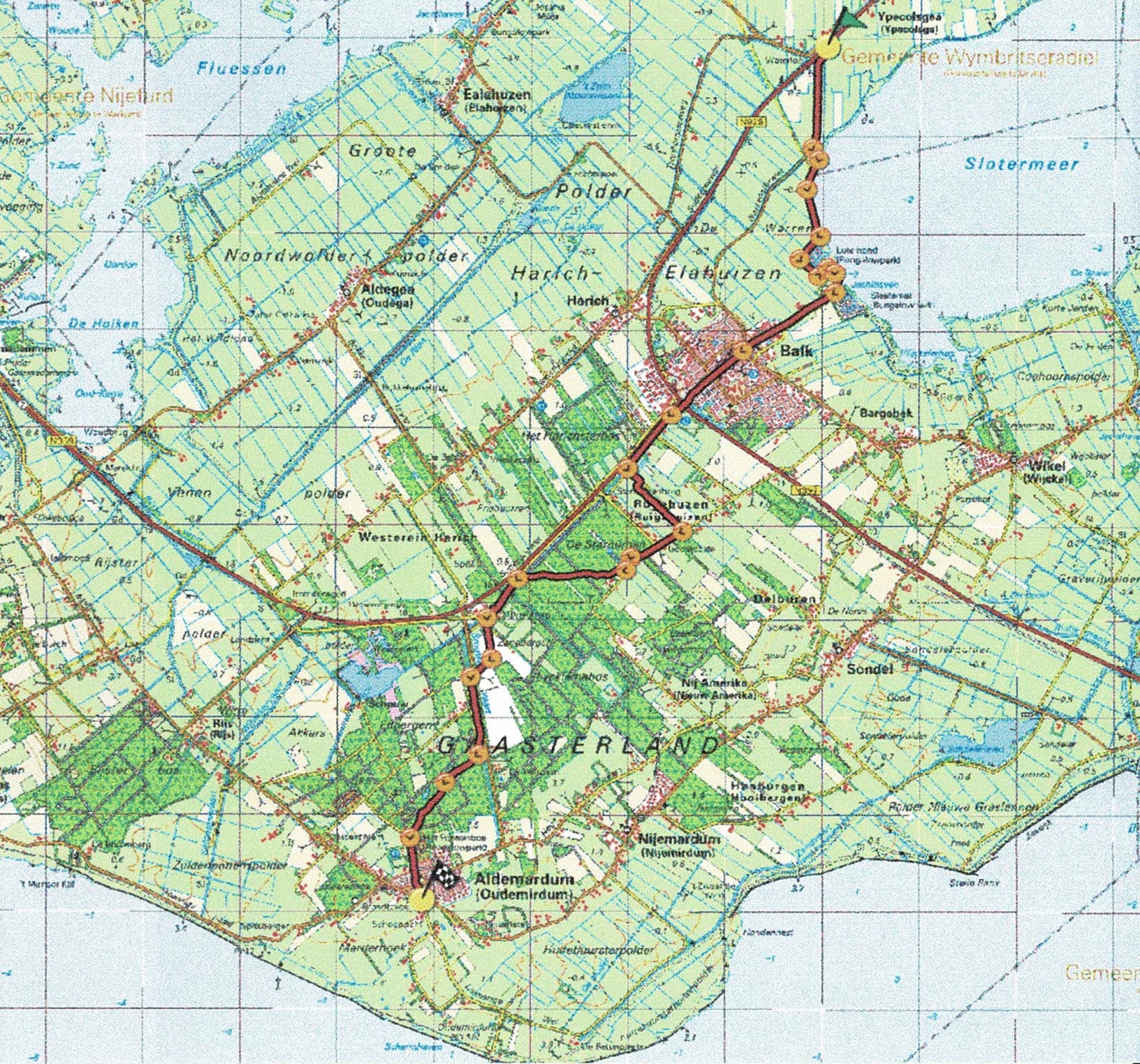 Ga verder RD met de Luts aan je rechterhand. Bij routepaaltje KP 64 LA. In de bocht naar rechts bij huisnr. 3 RD natuurgebied Nijemardemerheide in. Bij de ingang van het golfterrein RD. Aan het eind de asfaltweg en de Schaarslijpersbrug oversteken. Direct na de brug LA. Op kruising RD, wandelpad evenwijdig aan de asfaltweg. Na de Werkschuur Gaasterland RA en na infobord LA over het bruggetje, fietspad. Loop dit lange fietspad helemaal uit. Aan het eind LA en daarna links aanhouden, Fonteinwei. Na de kerk RD langs horeca tot de doorgaande weg met bushaltes.