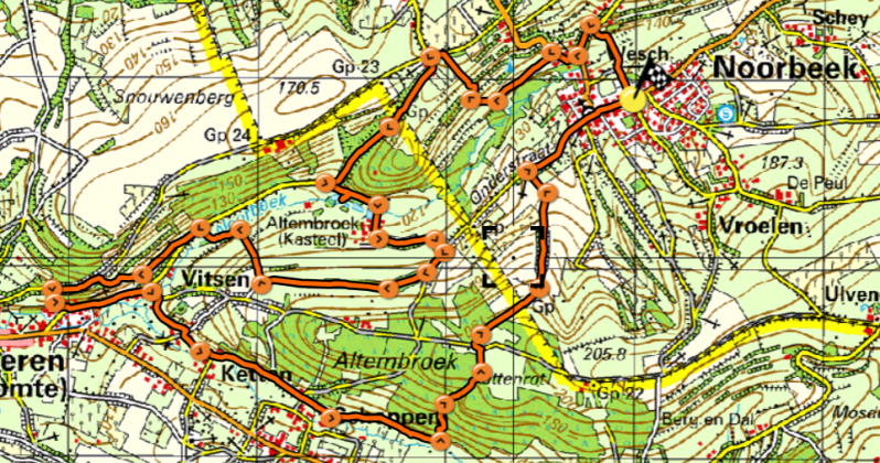 We maken een rondwandeling door en langs de beekdalen van de Noor en de Voer. De tocht begint in Noorbeek bij de St. Brigidabron. Al snel lopen we het beekdal in en bereiken we Landgoed Altenbroek waar de Noor extra water krijgt uit de daar aanwezige bronnen. Na het kasteel lopen we verder langs de rand van het beekdal, klimmen omhoog langs oude bomen met maretakken en ontmoeten de Noor opnieuw, nu als speelbeek. Hierna betreden we de hellingen van de Voerenberg met fraaie uitzichten over de Voerstreek. Het riviertje dat op deze omgeving haar stempel drukt komt in het gehucht Vitschen even om de bocht kijken, maar verdwijnt weer achter de huizen om daar het water van de Noor in ontvangst te nemen. In de buurtschap Meulenberg, waar vroeger een watermolen stond, komt de Voer weer tevoorschijn. We volgen nu het eeuwenoude voetpad dat de gehuchten Vitschen, Meulenberg, Ketten en Schophem met elkaar verbindt. Aan het eind klimmen we door het hellingbos omhoog en bereiken de Kattenroth, een bergrug die over de grens van Nederland en België loopt. Bovenop hebben we een weids uitzicht over de vallei van de Noor met de toren van de markante Sint Brigidakerk, die als een baken boven het golvende landschap uitsteekt. We dalen af over een holle weg en wandelen Noorbeek binnen, waar het landschap overgaat in de knusse dorpskern.