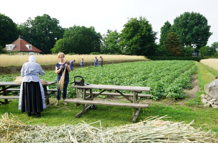 De oogsttijd is op dinsdag 3 juli 2017 van start gegaan. Iedere dinsdagmorgen, tot in augustus, wordt er tussen tien en twaalf uur op de ouderwetse manier geoogst. Het is erg leuk en gezellig om dan te gaan kijken. Op de eerste oogstdag was het voornamelijk aardappels rooien op de trapakkers. Ook werd een begin gemaakt met het maaien van het graan.
