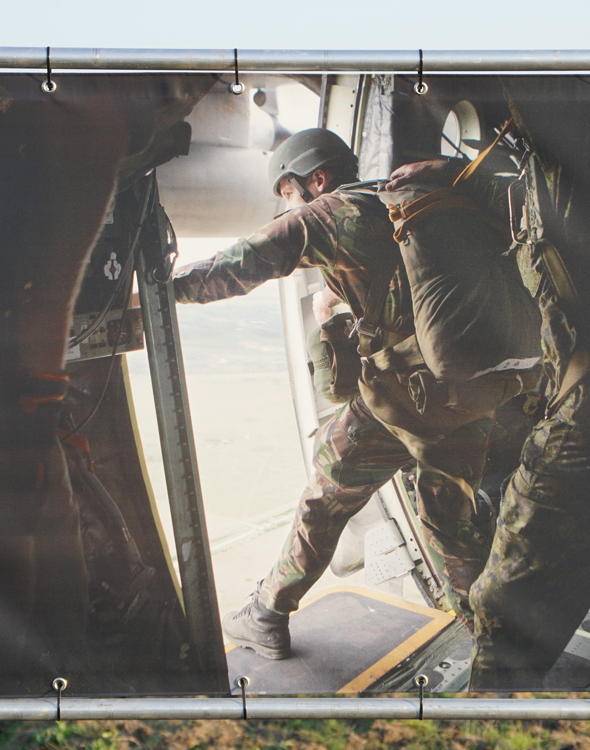 2. Loop rechts om het terras heen en tussen de restaurants door naar de verkeersweg. Steek over. Let op! 80 km. weg. Rechts is de Airborne gedenkplaats met het Airborne monument en de landmark Vensters op het verleden.