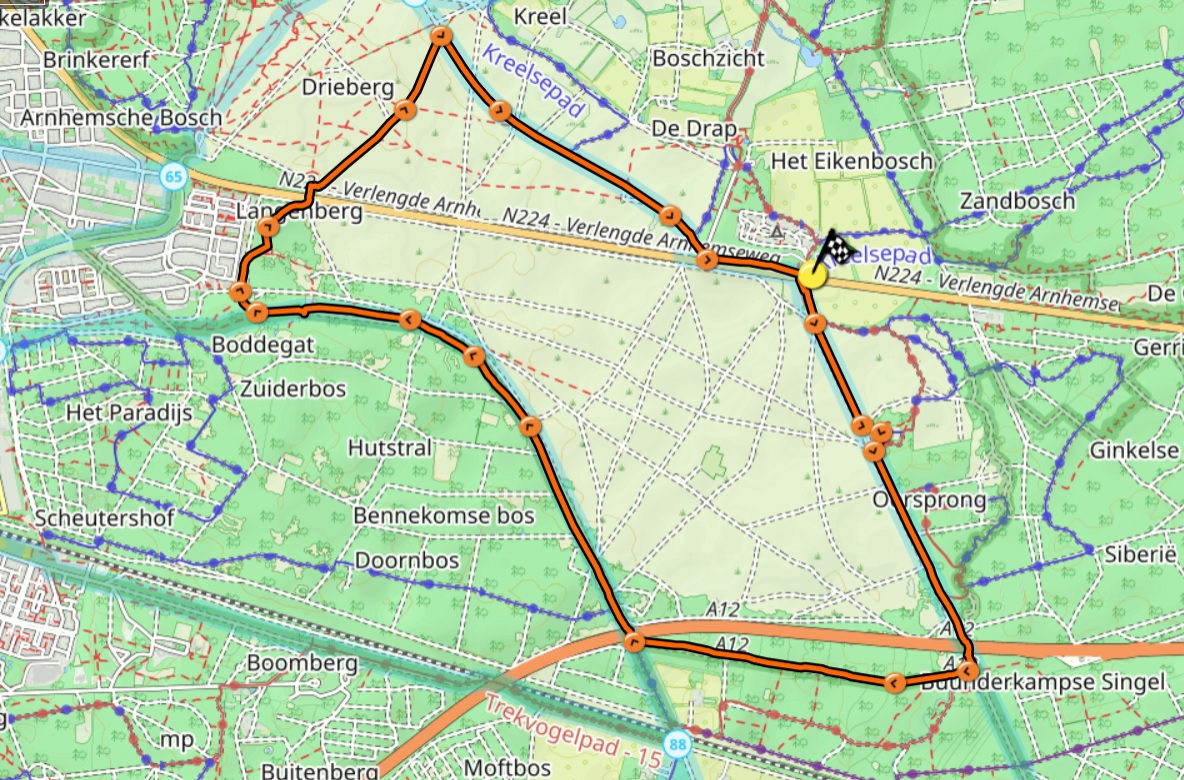 Start: Parkeerplaats De Ginkel, Verlengde Arnhemseweg 101, 6718 SM Ede (naast restaurant Juffrouw Tok).