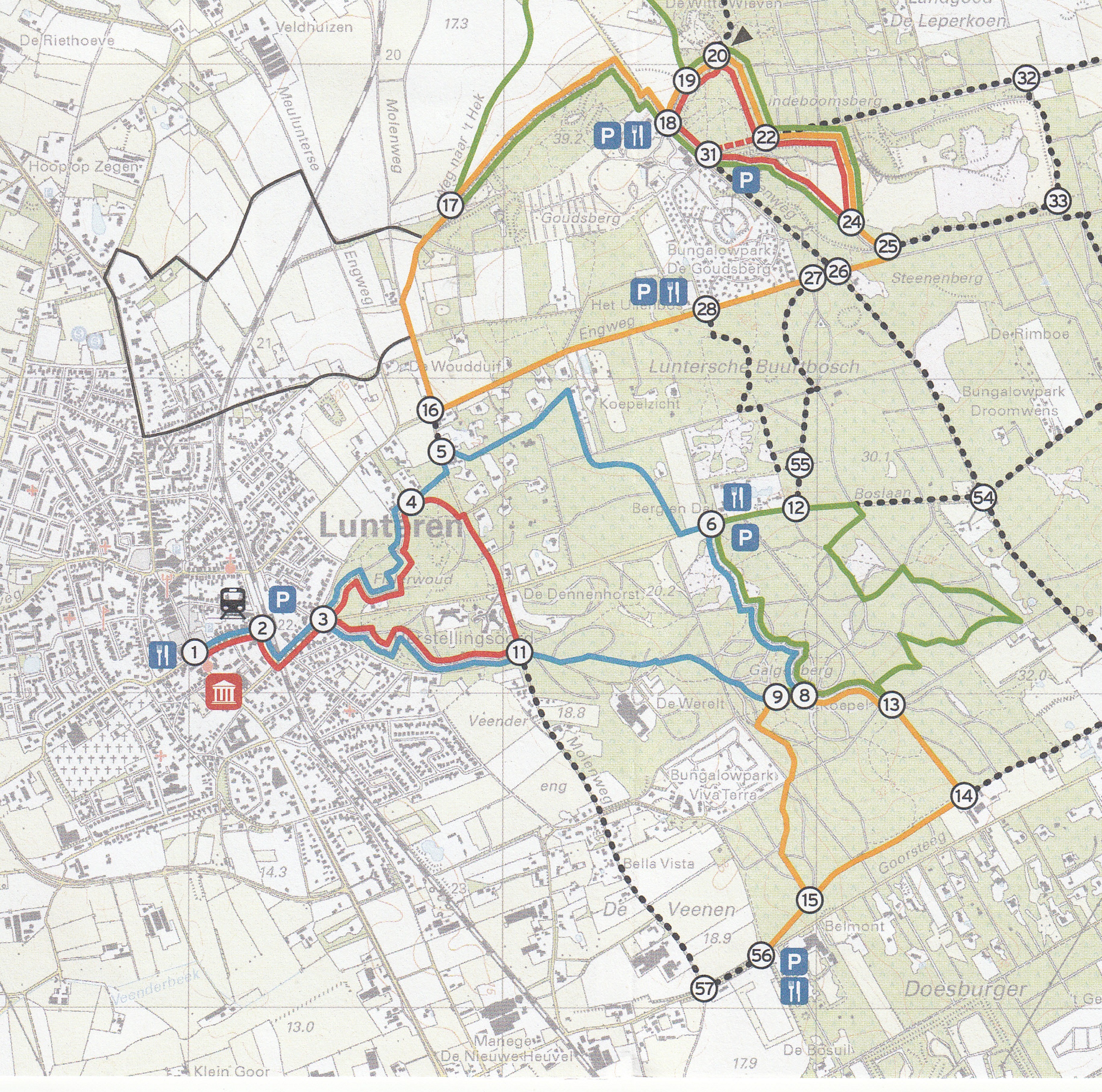 Trein:Station Lunteren. Loop van het perron af naar de spoorbomen. Ga hier linksaf (Boslaan) richting De Werelt. Op de hoek Boslaan / Bosrand starten bij de knooppuntenpaal. Ga schuin rechts, volg pijl ri. blauw 11. (Start hieronder bij 4.)