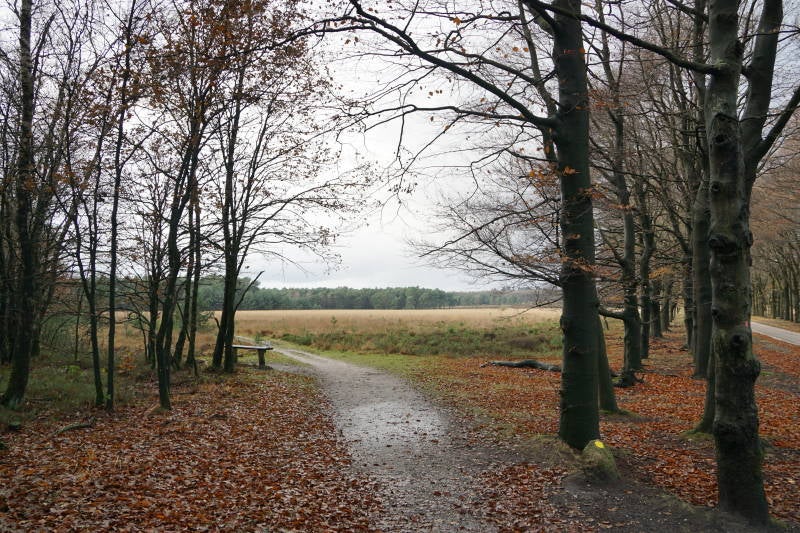 Links van het pad staat een bankje. Loop even verder.