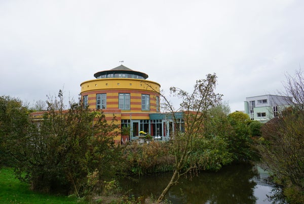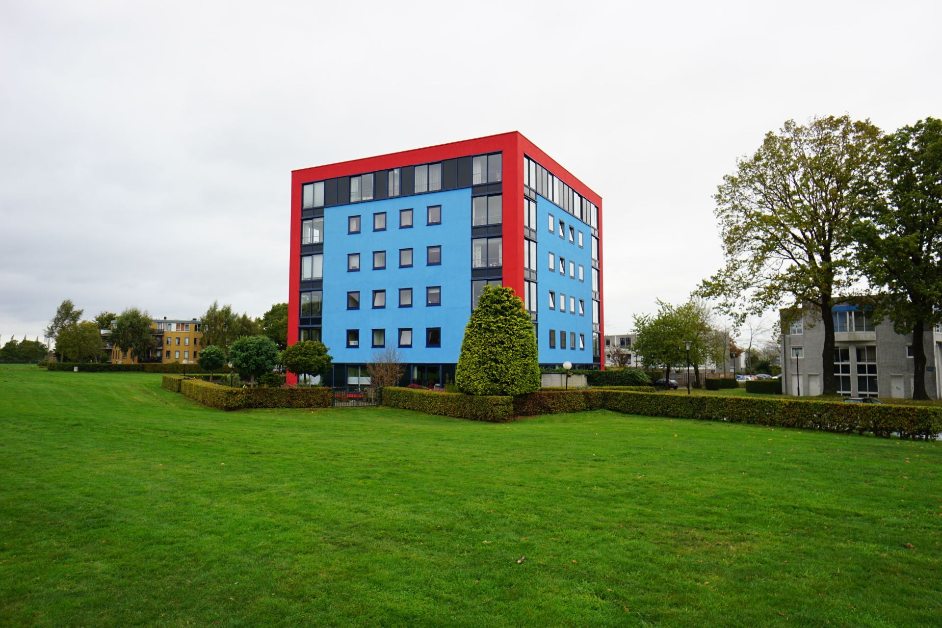 Het rood-blauwe kubusachtige gebouw herbergt een woongroep voor ouderen.