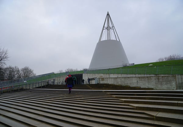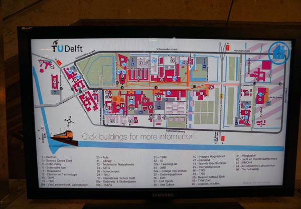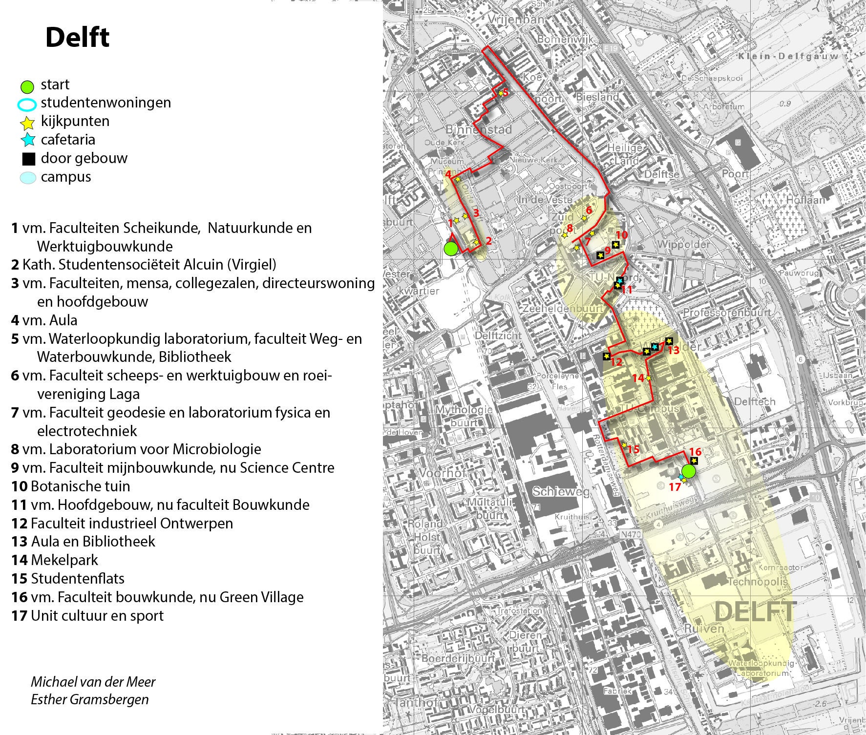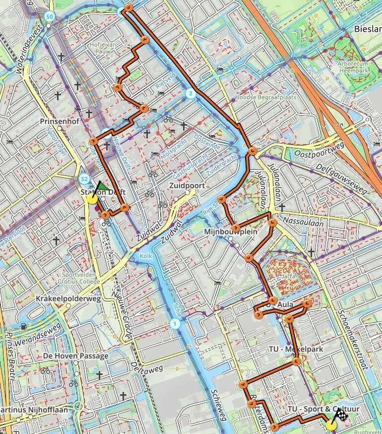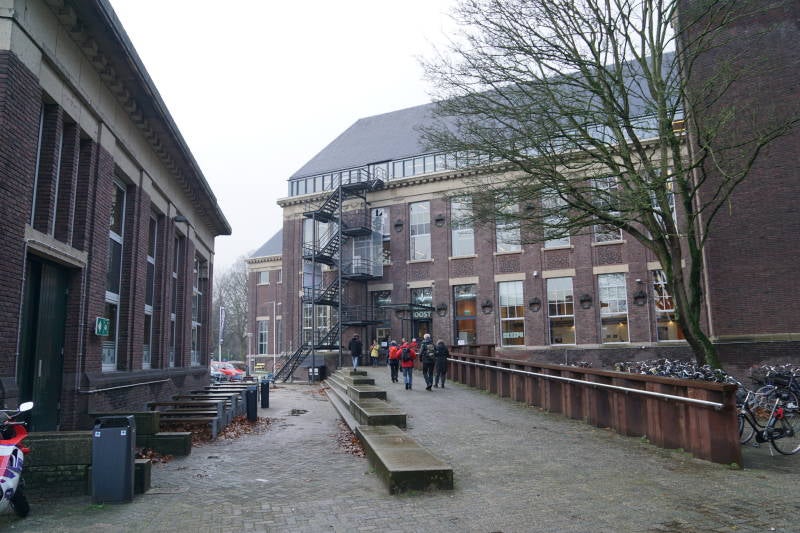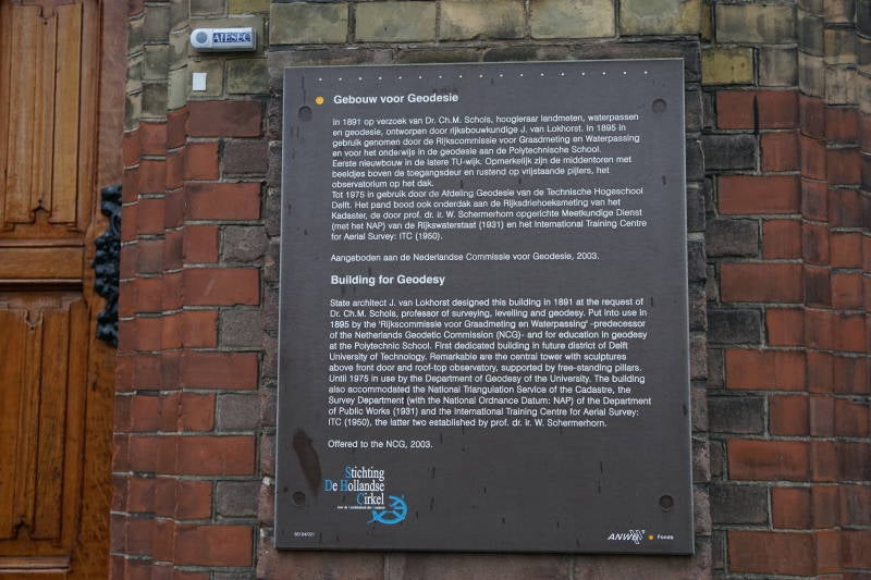 Aan de linkerzijde passeer je de voormalige faculteit Geodesie. Boven de deur staan beelden. In de voormalige faculteit Mijnbouwkunde is nu het Science Centre gevestigd.