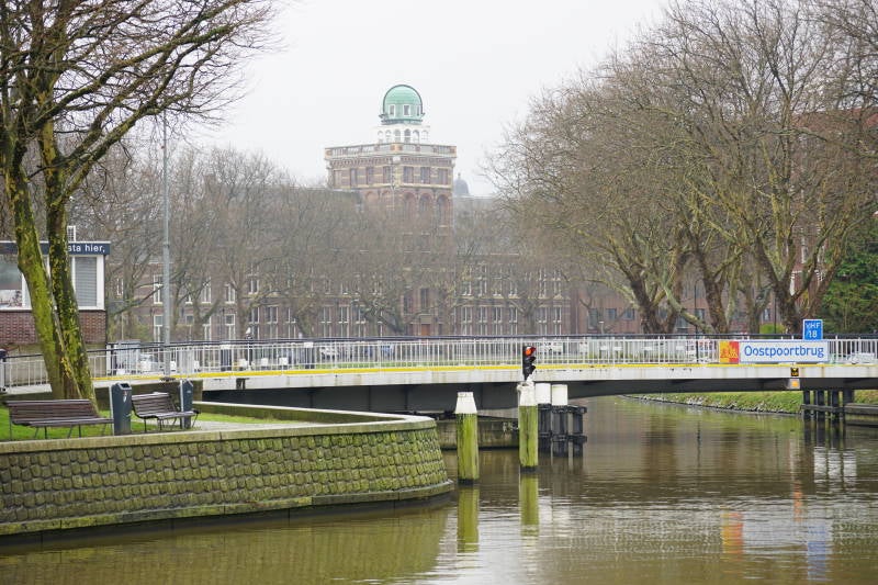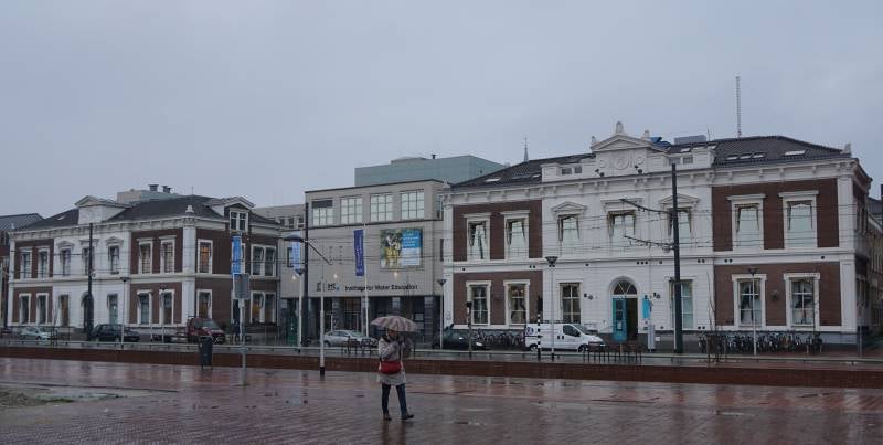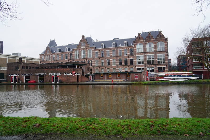 Voorbij de bocht van het kanaal zien zien we aan de overzijde zowel de roeivereniging als de voormalige faculteit Scheeps/Werktuigkunde die erachter staat.