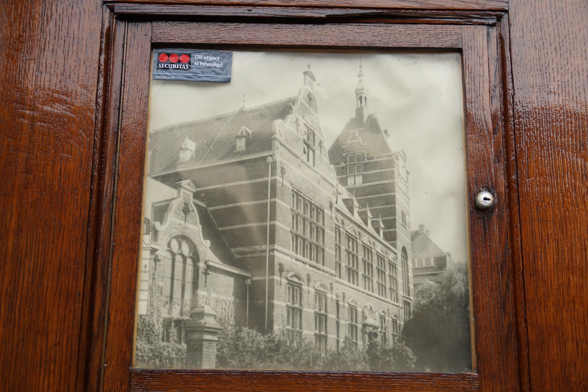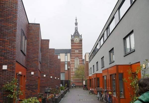 Verderop zie je tussen nieuwe woningen door het torentje van de voormalige bibliotheek van de universiteit. Op de deur is op een oude afbeelding te zien hoe het er vroeger uit zag.
