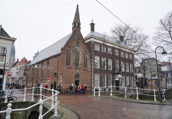 Nr. 95 was eertijds het hoofdgebouw van de universiteit. Lopend verder langs de Oude Delft zien we bij de brug de Heilige Geestkapel aan de overzijde.