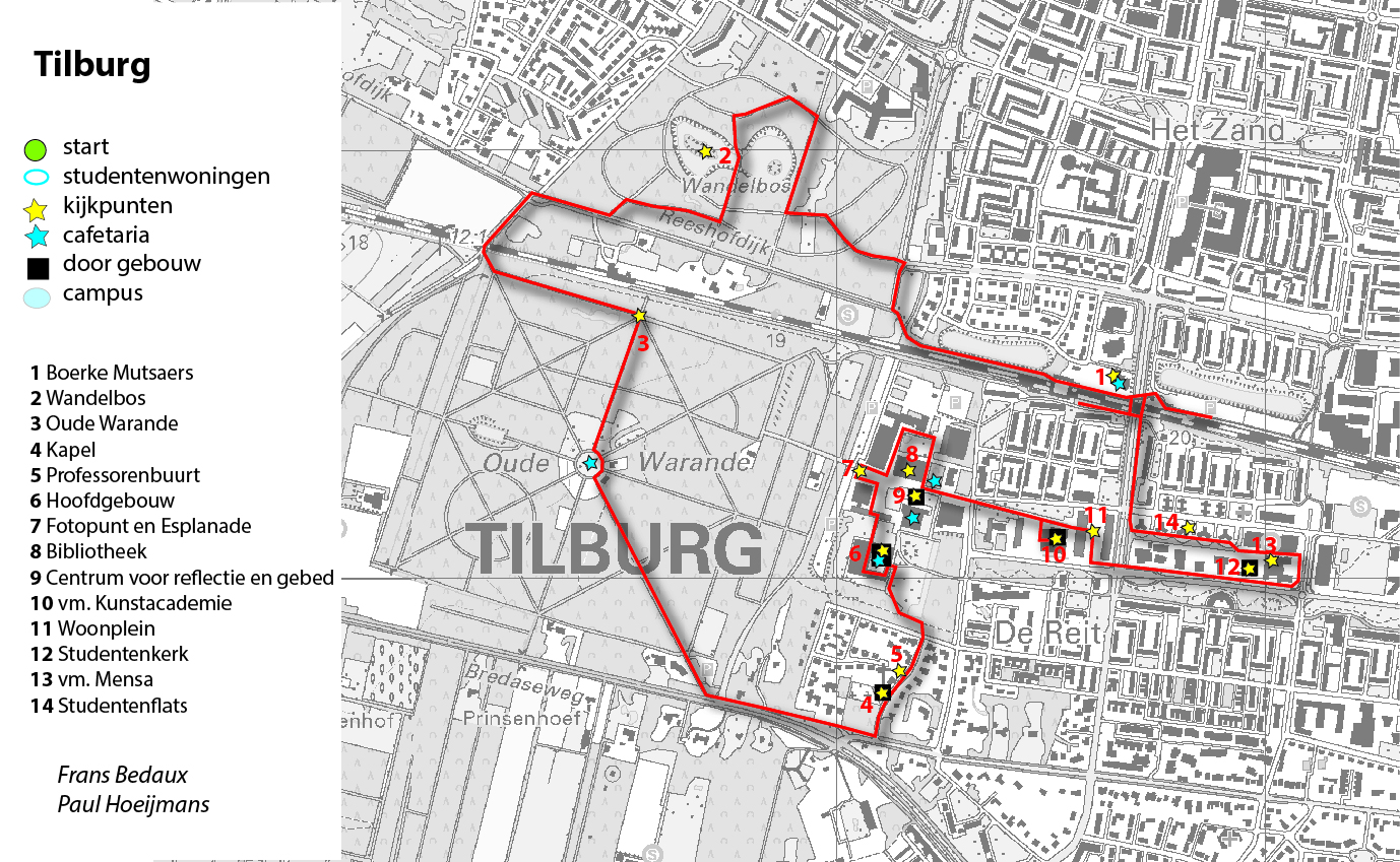 Het is een bijzonder modern klassiek gebouw met o.a binnentuinen, restaurant en een aula. Door de verbindingsweg gaan we naar de hoogbouw van dezelfde architect. Buiten gekomen staan we op de centrale ontmoetingsplek van de studenten. We lopen uiteindelijk over de Esplanada richting hoge flatgebouwen waar zowel studenten als inwoners van Tilburg wonen. We nemen een kijkje in de studentenkerk van de Maranatha parochie en komen langs de voormalige mensa van de universiteit, een gebouw op poten. Verderop, achter de tennisvelden staan de vijf sterflats,