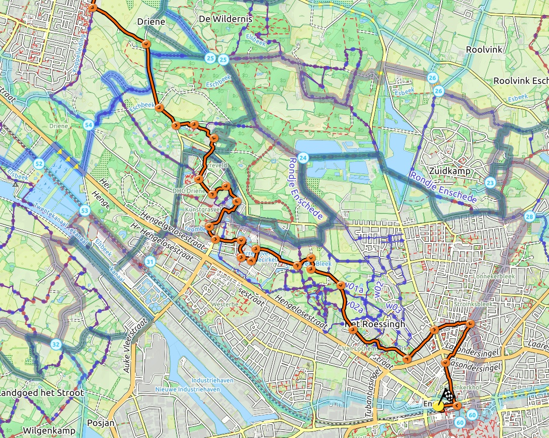 Deze lijnwandeling van 12 km start bij het station Hengelo Oost en eindigt bij het station in Enschede.