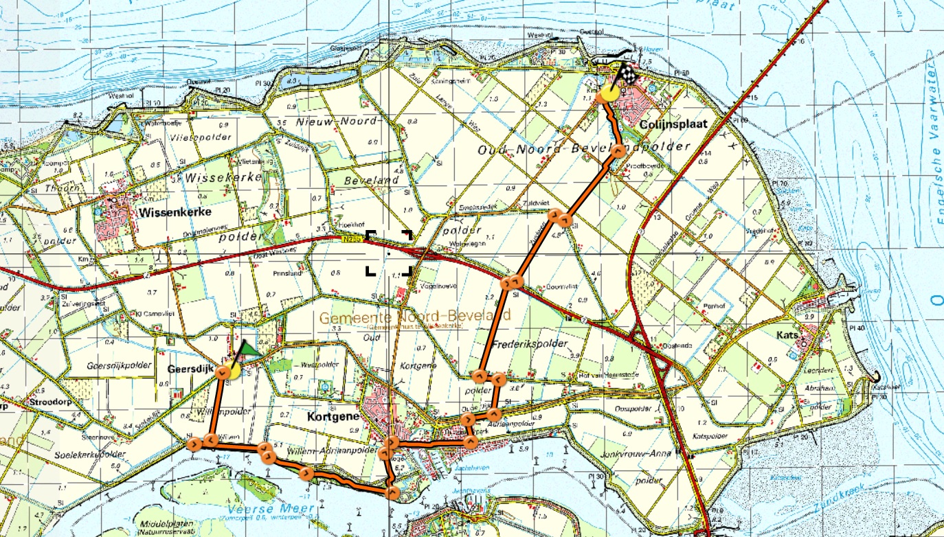 Vanaf Geersdijk lopen we langs de kreek die herinnert aan het vroegere riviertje Wijtvliet naar het bietenhaventje. Over een kronkelig pad door de Paardekreek lopen we naar Kortgene. De toren van de kerk heeft als enige de watersnood overleefd. Dan steken we het eiland over en pauzeren nog even op de Emelissedijk waarvan de naam herinnert aan het dorp Emelisse. Nog even verder naar het noorden en we naderen langs een watergang Colijnsplaat.