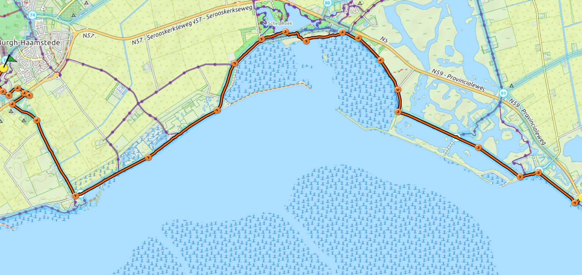 Met deze lengtewandeling gaan we op pad langs de zuidkust van Schouwen. Er is veel te zien, te horen en te beleven. Vanuit Burgh loop je door de historische ringwalburg naar het haventje van Burghsluis. In de Plompe Toren beleef je de geschiedenis van Koudekerke en de verdronken dorpen van Het Zuidland. We lopen even het krekengebied van De Schelphoek in en kijken daarna uit op de Roggenplaat waar je vogels en zeehonden kunt spotten. Na het passeren van een zeeboerderij gaan we over de dijk naar het volgende uitkijkpunt: Prunjehil. Op weg naar Flaauwershaven worden we getrakteerd op een vogelconcert. Lopend op de kruin van de dijk langs de Inlaagweg zie en hoor je links en rechts o.a. de rot- en brandgans, bergeend, tureluur, grutto, kluut en lepelaar.