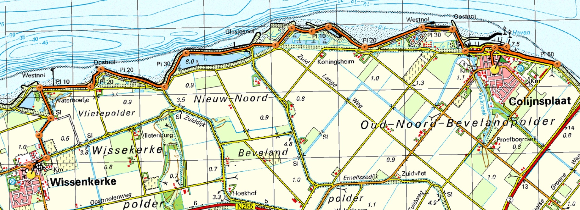 Keer terug over het fietspad. Bij de splitsing is een infopunt over de verdronken dorpen. Houdt rechts aan langs het rood-witte hek. Vóór de jachthaven LA en langs de visafslag RD tot de replica van de tempel Nehalennia. Ga vóór de tempel met de trap de dijk op en RA. Steek de asfaltweg over, ga tussen de meerpalen door en direct RA over een smal pad op de dijk. Je loopt langs een Muraltmuurtje dat vroeger diende als dijkversterking. Buig mee naar rechts tot de asfaltweg. Steek deze over en vervolg het pad over de dijk. Bij Strand Orisant verlaat je de dijk aan de rechterkant en ga je verder over het fietspad. Je komt langs een info- en rustpunt van Nationaal Park Oosterschelde. Ter hoogte van dit rustpunt lag in de Oosterschelde het eiland Orisant.