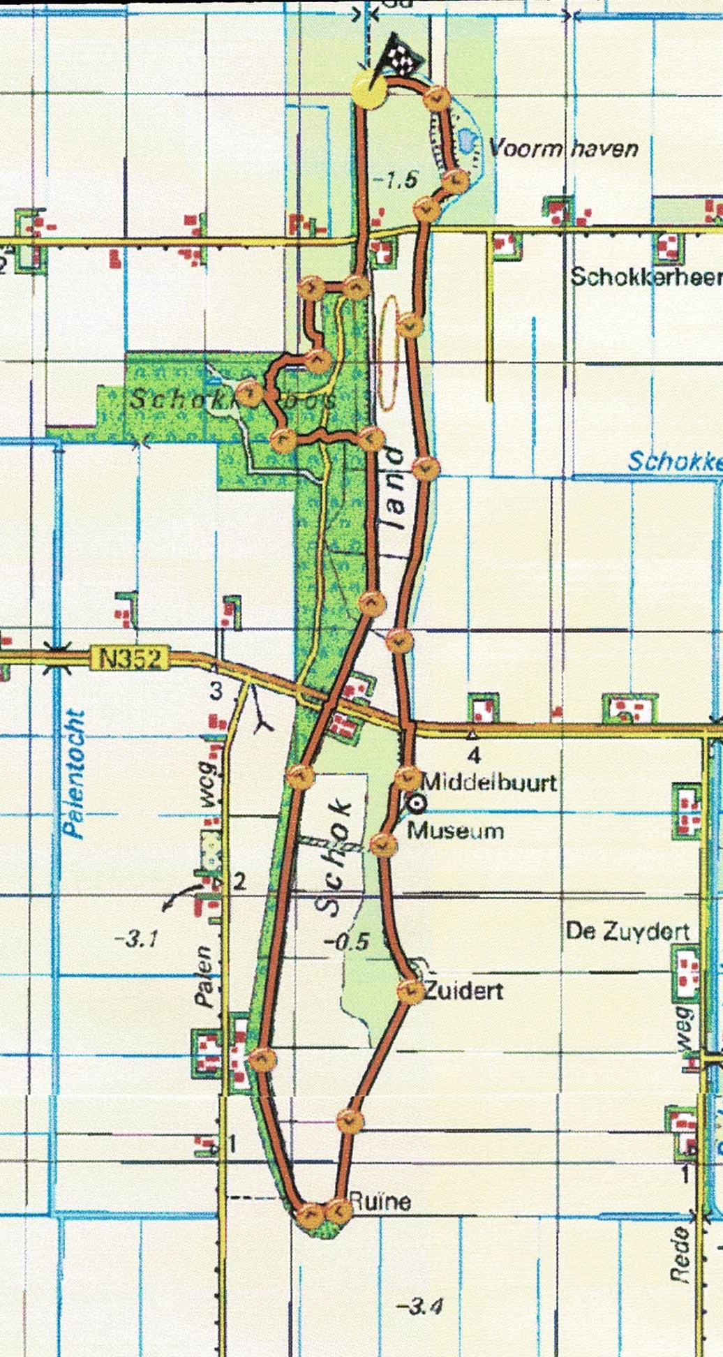 We maken een rondwandeling langs de contouren van het oude eiland. Daarbij beginnen we aan de noordkant waar Emmeloord lag. Via de terp Middelbuurt waarop het museum, de kerk en nog een paar oude huizen zijn gelegen, gaan we naar de Zuidert. Op de uiterste zuidpunt vinden we de ruïne van de kerk van oud Ens en de plaats waar de vuurtoren heeft gestaan. Op de terugweg dalen we even af naar de voormalige zeebodem en duiken het Schokkerbos in. Het bos is bijna zeventig jaar oud en aangeplant op klei, keileem en veen. Vruchtbare grond voor varens, mossen en paddenstoelen. Slingerend door het bos keren we terug naar het dijkje. Nog een kleine kilometer en we zijn weer terug bij af.