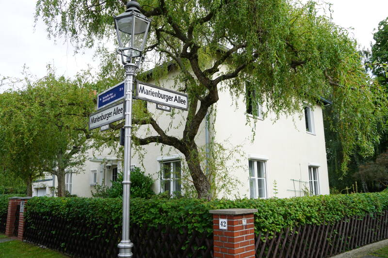 Loop terug naar de kruising en ga rechtsaf langs het Lietzenseepark. Je komt uit op de Kaiserdamm. Hier linksaf. Loop door tot de Theodor-Heuss-Platz. Houd links aan en loop langs het park. Aan het eind van het park op Y-splitsing links aanhouden en de Heerstrasse in. Volg de Heerstrasse tot het S-Bahnstation Heerstrasse. Ga linksaf de Boyenallee in. Met de bocht mee, Kurländer Allee. Eerste straat linksaf, Soldauer Allee. Even voor het eind rechtsaf, Marienburger Allee. Op kruising met Willenberger Pfad linksaf. Op nummer 43 bevindt zich het Bonhoefferhuis.