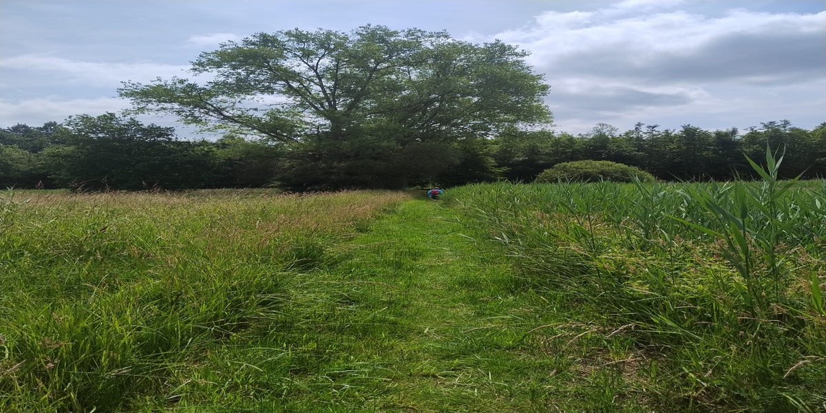 We verlaten het landgoed en volgen de Klarenbeek door de velden, raken de beek in het bos even kwijt maar pikken hem weer op in het Beloofde Land. Langs het pad over dit nieuwe landgoed is het een ware bloemenweelde met fladderende vlinders en zoemende bijen. Kikkers springen voor onze voeten weg. In de verte schittert een moderne robuuste waterburcht.