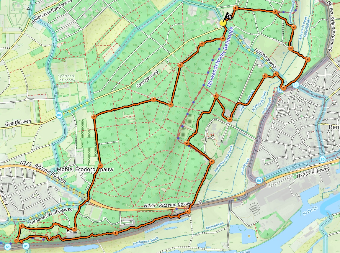 Ga tegenover ingang Nol in ’t Bosch het grasveld over. Neem het pad tussen de bomen door. Op 4-sprong RA. Volgende 4-sprong weer RA. Steek na 30 m. halfverhard pad over. Bij 1e en 2e Y-splitsing links aanhouden. Bij T-splitsing vóór beekdal RA. Wandel langs de rechteroever van het vennetje. Einde vennetje links aanhouden en na de banken rechts. Steek via het vlonderpad het beekdal over. Aan de overkant RA tot de verharde weg. 20 m. naar rechts staat het papiermolenmonument. Steek de weg over en ga RA over de brug Halveradsbeek. Eerste pad LA (aan ’t begin van het oliemolenmonument). RD over pad met betontegels door het beekdal. Vlak voor ’t eind bij bankje rechts aanhouden. Bij asfaltweg LA. Na huisnr. 7 vóór schuur RA. Dit pad met bochten mee volgen. Op 4-sprong met 2 banken LA. Bij fietspad RA en even verder 1ste pad LA. Op 4-sprong RD. Volgende 4-sprong breed zandpad oversteken (voor horeca LA). Daaropvolgende 4-sprong LA. Bij huisnr. 31 en 33 RD. Asfaltweg met bocht naar rechts volgen tot voorrangsweg. Voorrangsweg oversteken via de vluchtheuvel. Even RA en bij ANWB wegwijzer LA richting knooppunt 81. Na pompstation RA trap op. Eenmaal boven LA Bergpad. Bergpad op de rand van de stuwwal steeds volgen. Bij scherpe bocht met trappen RD omhoog het park in. Bij bord Welkom in Belmonte LA en schuin RD langs rododendrons (Klompenpad). 1e pad LA naar uitkijkpunt. Na uitkijkpunt 2e pad LA. Na volgende uitkijkpunt op T-splitsing RA. Pad met bocht naar rechts volgen. Steeds RD tot T-splitsing. LA en na 30 m. RA. RD tot asfaltpad. Langs afsluitboom RD over parkeerplaats. Einde parkeerplaats LA naar voorrangsweg. RA naar rotonde en hier oversteken. RD Scheidingslaan in. Einde asfaltweg langs slagboom met de bocht mee naar links. Op 4-sprong na wijngaard RD. 1ste pad RA (ter hoogte van toegangshekje naar weiland). Steeds RD tot asfalt fietspad. RA over wandelpad evenwijdig aan fietspad. Waar wandelpad ophoudt 2e pad LA (ruiterpad). Loop door tot meersprong met bordjes. Bij bordje Veluwe Dorschkamp RA. Zijpaden negeren en ong. 500 m. RD. Einde pad bij T-splitsing LA tot verkeersweg. Hier LA naar parkeerplaats Nol in ’t Bosch.