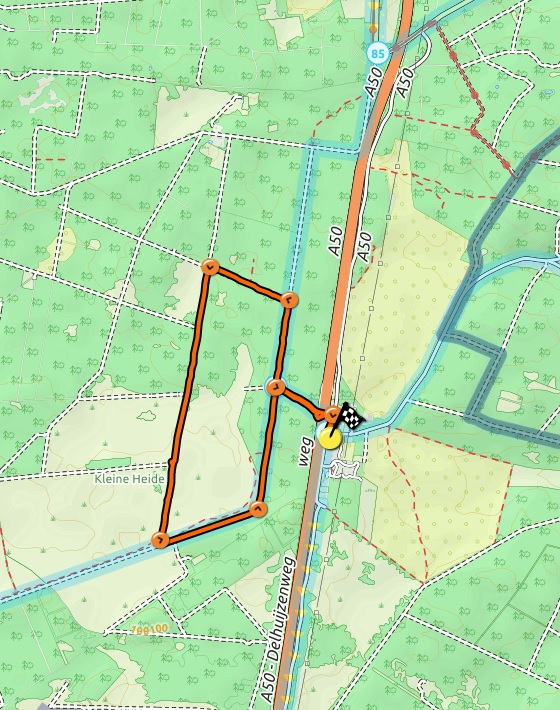 Loop vanaf de parkeerplaats terug naar het tunneltje. Onder de A50 door. RD over wildrooster. Asfaltpad wordt grindpad. Bij viersprong (knooppunt 86) RA. 1e weg LA (blauwe route) 1e weg LA (blauwe route) Bij de heide aangekomen RD. Weg langs Wouter Memorial vervolgen. Aan het eind bij T-splitsing LA (grindpad). Pad met bocht naar links volgen. 1e grindpad RA (bij knp 86). Na tunnel RA naar de parkeerplaats.